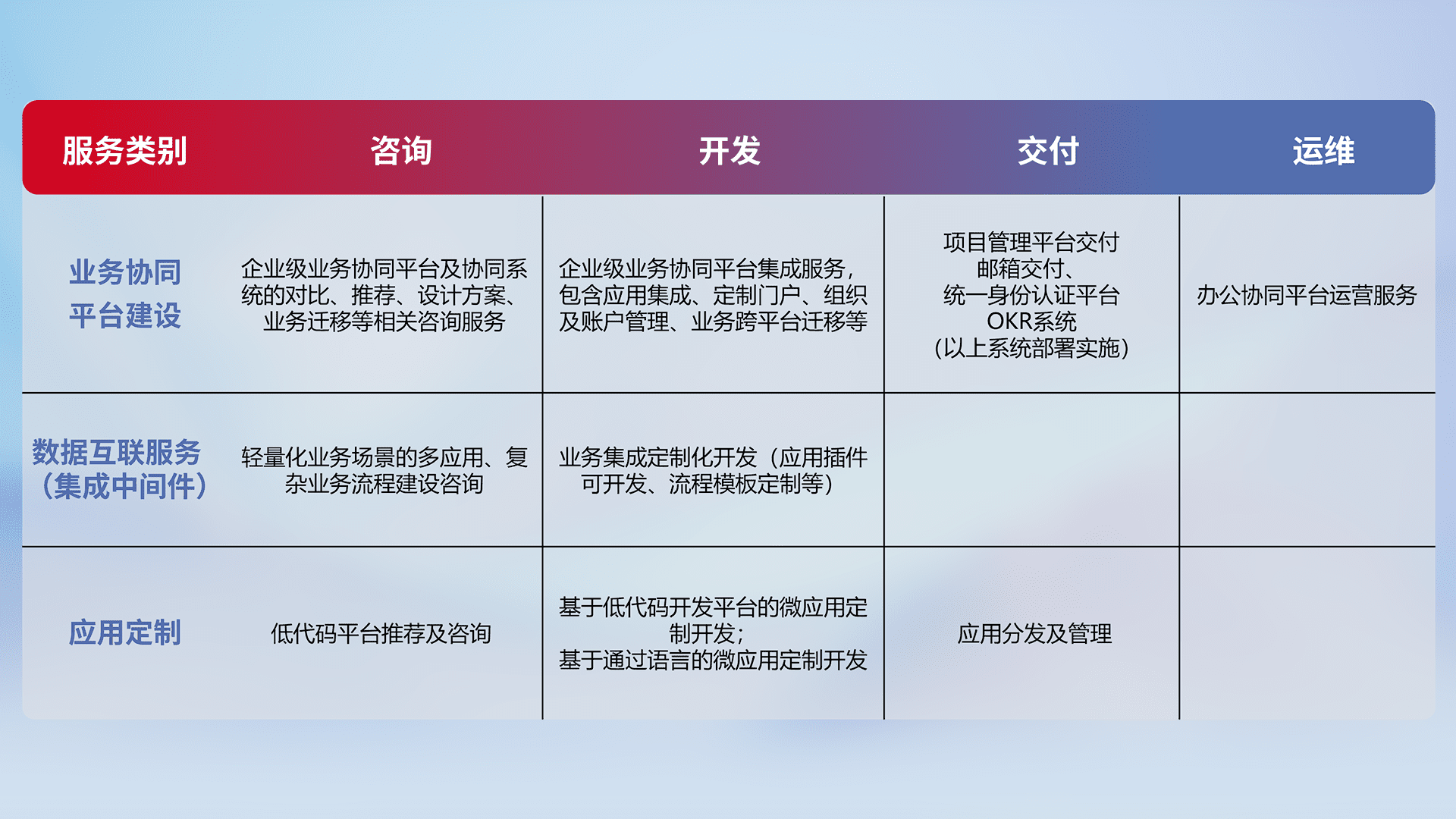 针对钉钉、、、企微、、、、IDaas等平台级产品提供产品的规划、、、方案、、、交付、、、定制化开发等服务,,实现如统一协同办公、、智能客户服务、、、、混合会议管理、、、智能数据查询、、、等业务场景,,实现数字化转型。。。